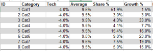 {"ID", "Category", "Growth %", "Attribute", "ID2", ""}),